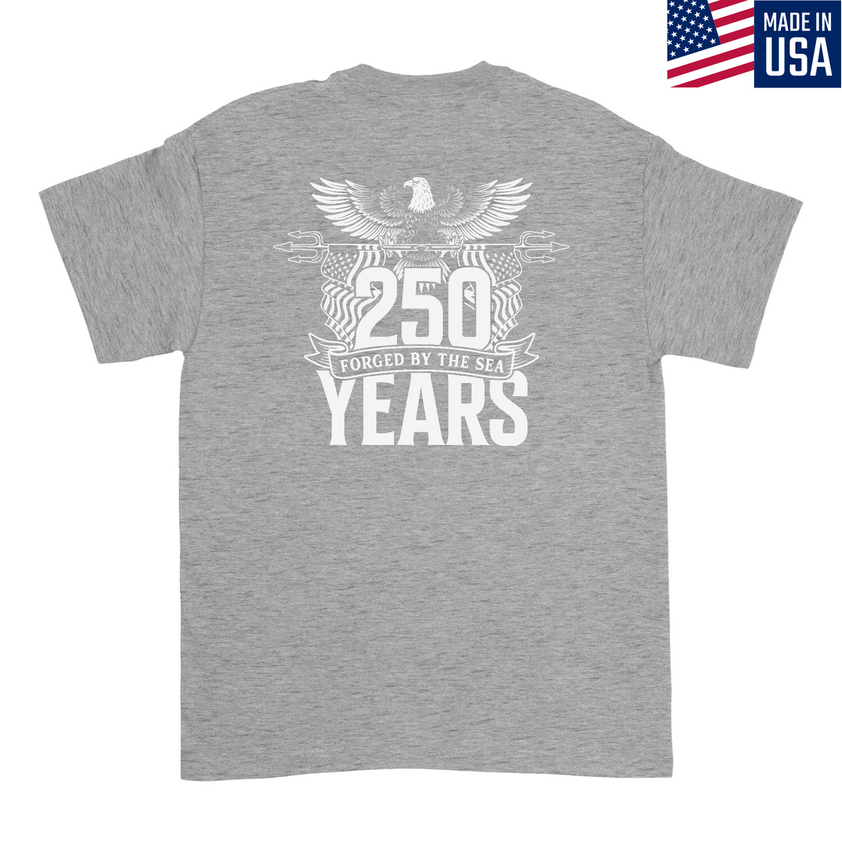 Carry the Navy’s fighting spirit with the Forged by the Sea® T-Shirt. Featuring the U.S. Navy’s official slogan alongside a bold design, this shirt honors Sailors past and present while celebrating the Navy’s 250th anniversary. Made from soft, durable cotton, it’s built for comfort whether you’re active duty, a veteran, or a proud Navy family member. Perfect for Navy birthday events, patriotic celebrations, or everyday wear, this tee showcases the resilience and tradition that has defined America’s Navy since 1775.